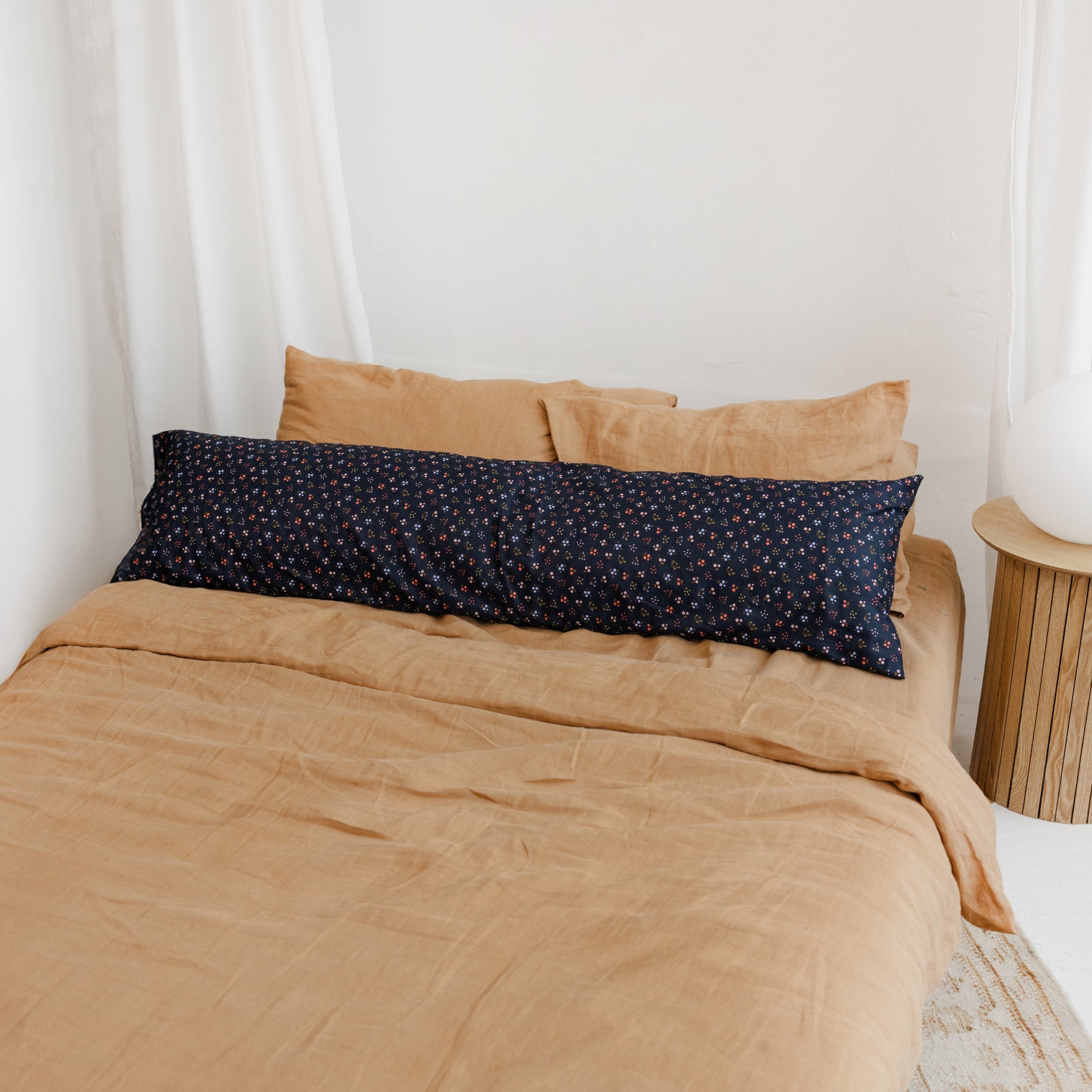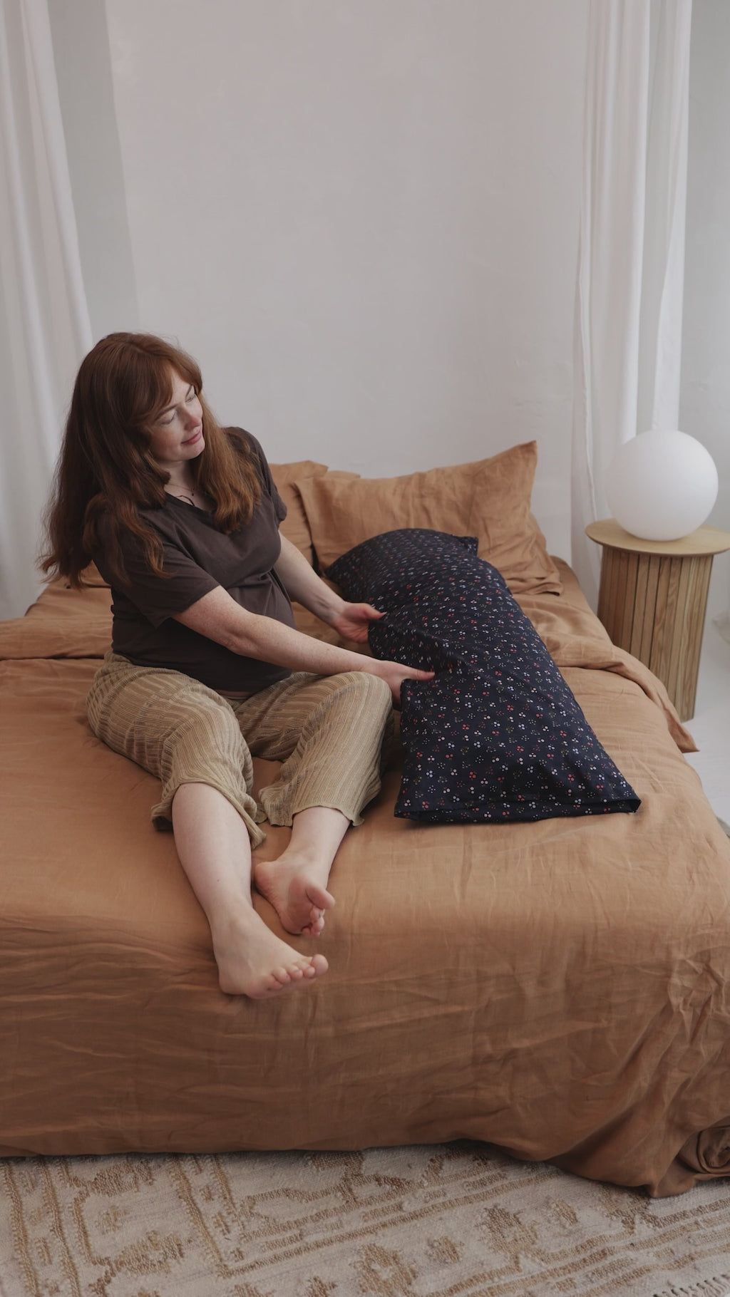 Create comfortable, full-body support with MINICAMP’s Long Maternity & Lumbar Support Pillow with Organic Floral Print Cover in Navy Blue, designed to support pregnancy, lumbar alignment, and restful sleep. This long pillow, sized 57 x 16 inches / 145 x 40 cm, is crafted for adults and helps relax the hips, back, neck, and abdomen, letting the body settle into a calmer rhythm.